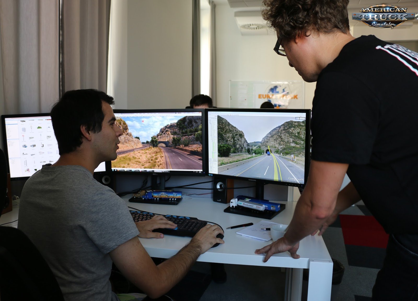 As the next step in this phase, all these gathered data are further divided to smaller teams of designers, or to individual map designer and then they are going to start creating the actual state in our map. If you want better example, I can give you some information that one of our map designers for American Truck Simulator has provided to me. His name is Patrik (the guy on the left in the photo below), he is 21 years old and he is behind the US 101 part of the ATS map, which starts in Oxnard and ends in the crossing with CA 58 road.